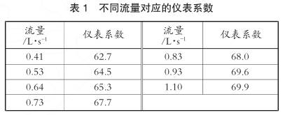 其中自變量為流量,因變量為儀表系數。當流量介于0.4~1L/s時,采用式(1)進行計算;當流量超過1.1L/s時,保持儀表系數恒為69.9。