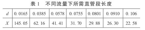 3.直管段長度和衛生型液體渦輪流量計精度的初步預測在工程設計中,根據流體性質、流量和雷諾數確定α和d值。這樣,按照式(5)就可以依不同的流量計精度要求,對直管段長度進行初步預測,或確定直管段長度后,對流量計的精度做初步預測。當δ= 0.2%時,不同流量下所需直管段長度見表1。