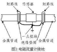 (4)盡量避開振動源、磁源(大功率電機、變壓器)由于樹脂計量表的測量感應(yīng)電壓很小,電壓較低,易受外界電磁噪聲的影響,故在安裝時應(yīng)進行可靠的接地連(跨)接。金屬管道樹脂計量表接地連(跨)接方法如圖3所示