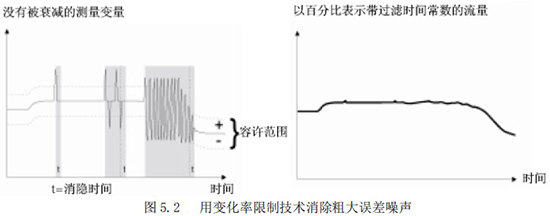 “變化率限制值”與“不敏感時間值”是用來消除某些增加阻尼不能除去的噪聲。它能夠從真實的流量信號中判別出階躍信號引起的噪聲和漿液尖狀噪聲。這種判別是以變化率的限制和持續(xù)時間為依據(jù)的。圖 5.2 所示為使用變化率限制技術去除粗大誤差的原理說明。該功能為在前面采樣中獲得的流量數(shù)據(jù)經(jīng)一階濾波后的,設定某一上限和下限(變化率)。如果當前采樣的流量數(shù)據(jù)超過或低于這個*限值,而且在超過或低于這個*限值的變化時間之內,則認為這種變化是由于噪聲所引起的,CPU 予以切除;而當超過或低于這個*限值的變化在設置的不敏感時間以外,則認為這種變化是由于真正的流量變化所引起,CPU 就認可是測量流量的變化。