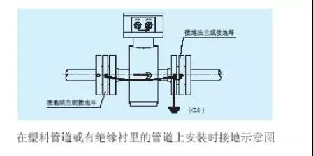 b.傳感器在塑料管道上或在有絕緣襯里的管道上安裝,傳感器的兩端應(yīng)安裝接地環(huán)、或接地法蘭、或帶有接地電*的短管,按下圖接地。使管內(nèi)流動(dòng)的被測介質(zhì)與大地短路,具有零電位,否則,補(bǔ)水流量計(jì)無法正常工作。